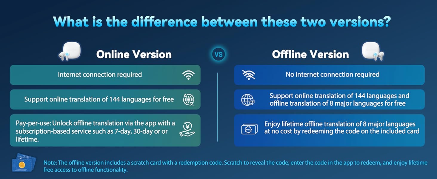 Our Wooask® M3 translation earbuds support both online and offline translation. You can choose the version that suits your needs, and there are no additional fees after purchase.