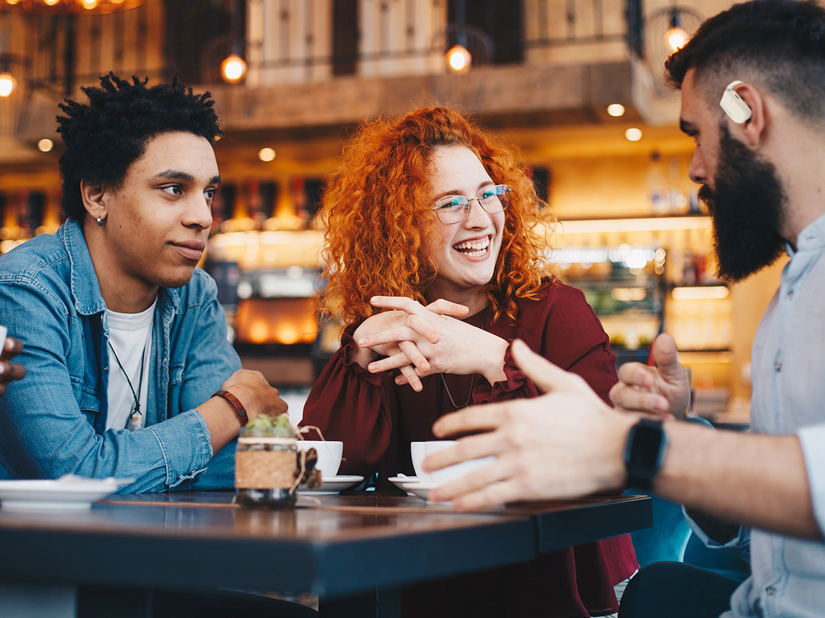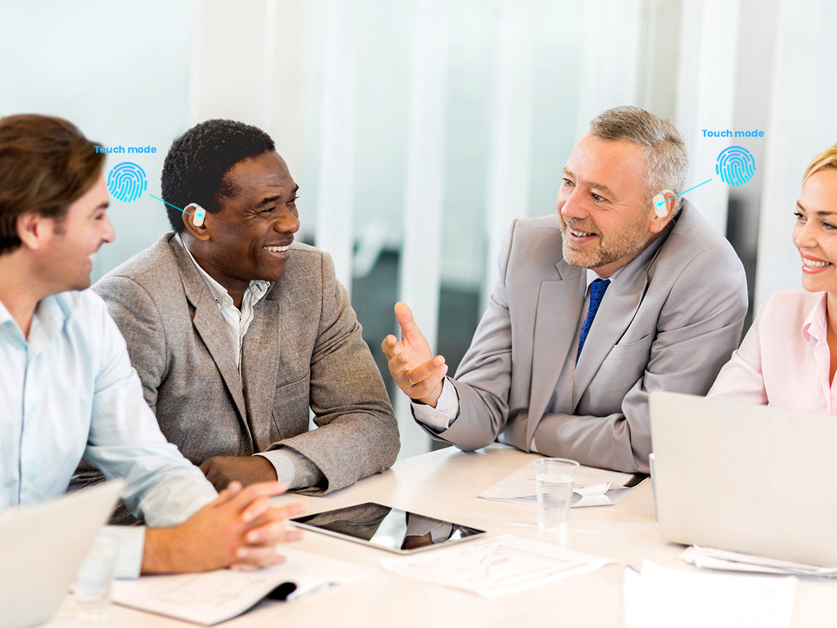 Each wear one earphone. Tap the earphone to start/stop translation. Ideal for acquaintances.