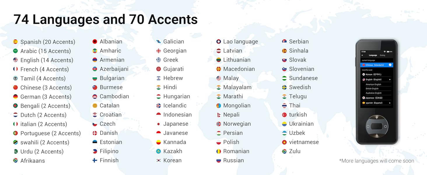 The Wooask® W10 Translator can operate without internet for most functions. It provides offline translation capabilities for 16 major languages, such as Spanish, English, Chinese, Japanese, French, German, Arabic, Russian, Korean, and Thai.