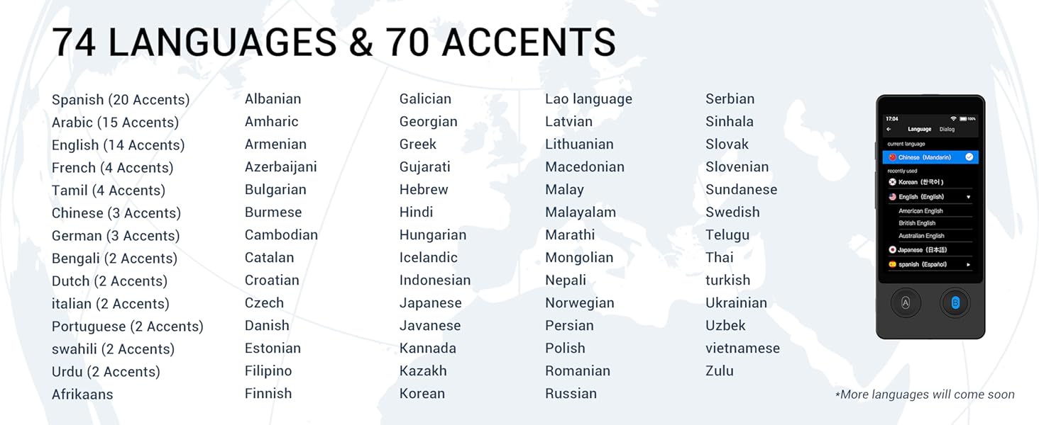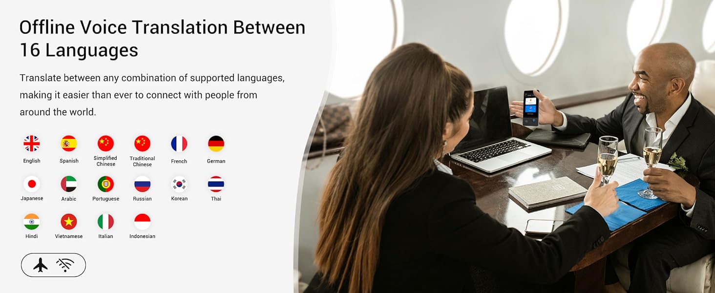 The Wooask® W12 Translator can operate without internet for most functions. It provides offline translation capabilities for 16 major languages, such as Spanish, English, Chinese, Japanese, French, German, Arabic, Russian, Korean, and Thai.