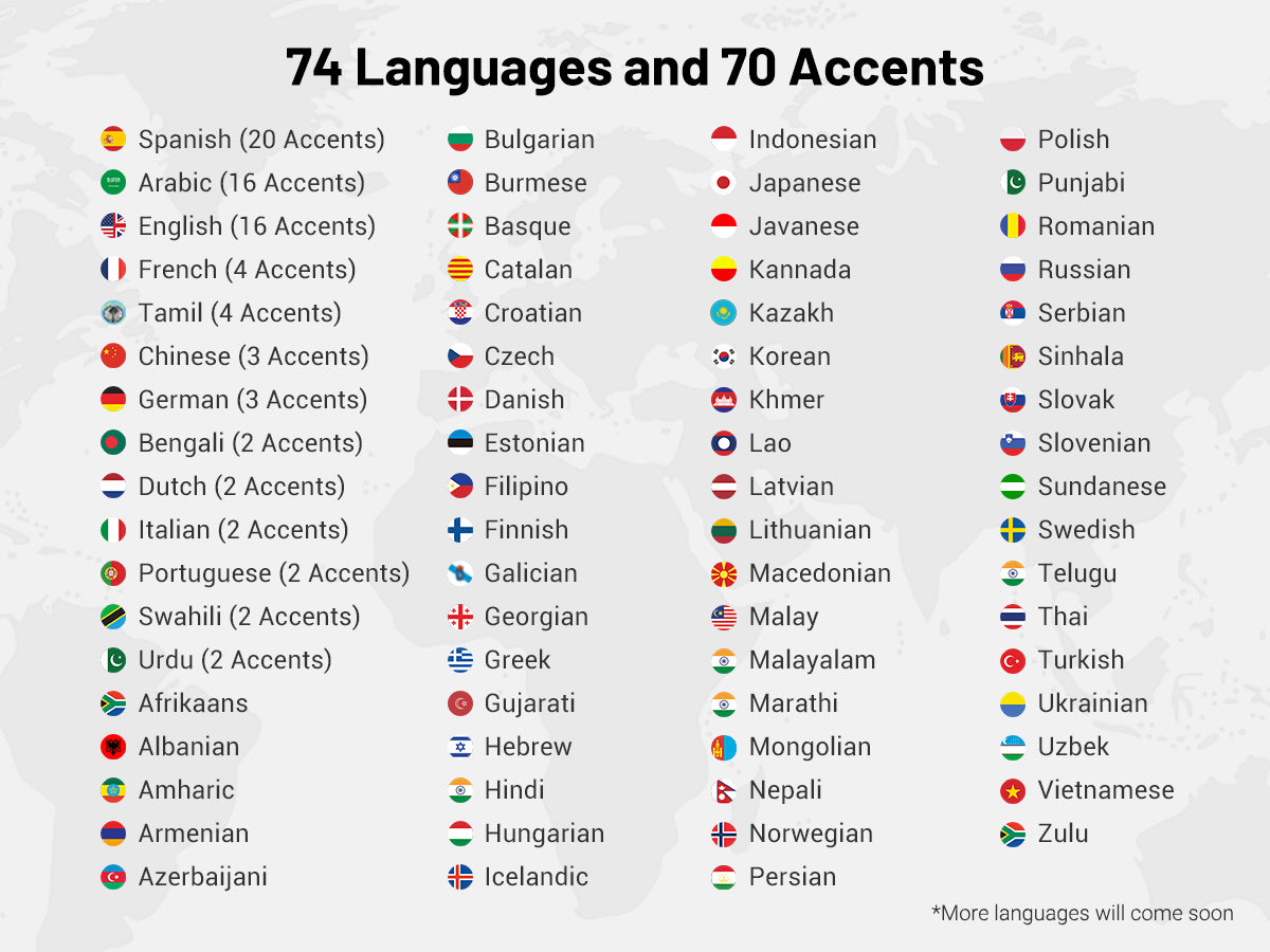 Online languages: 144 languages(74 Languages and 70 Accents)