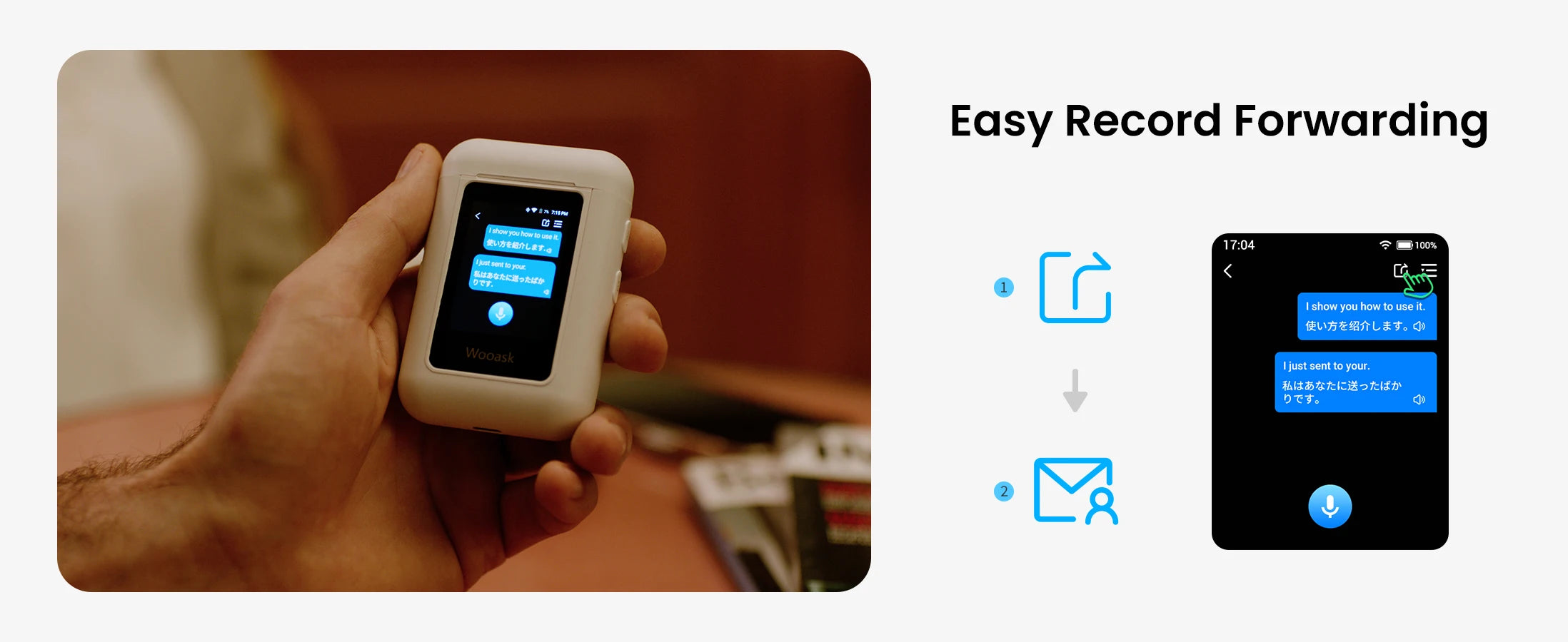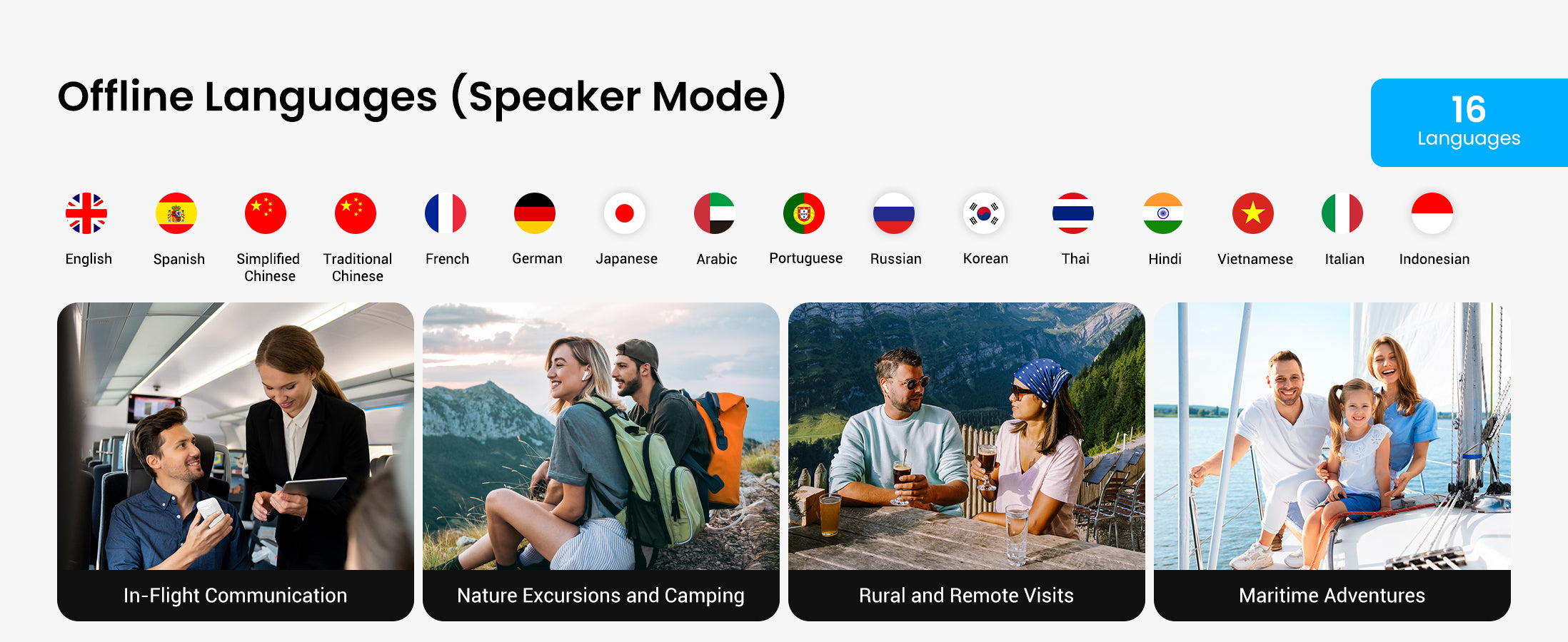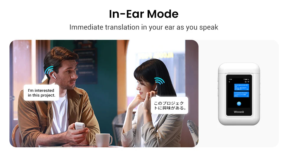 In-ear mode requires both speakers to wear earbuds ensuring discreet communication. In contrast, speaker mode allows for external playback of translation results through a powerful 2W speaker, making it ideal for group settings or noisy environments.