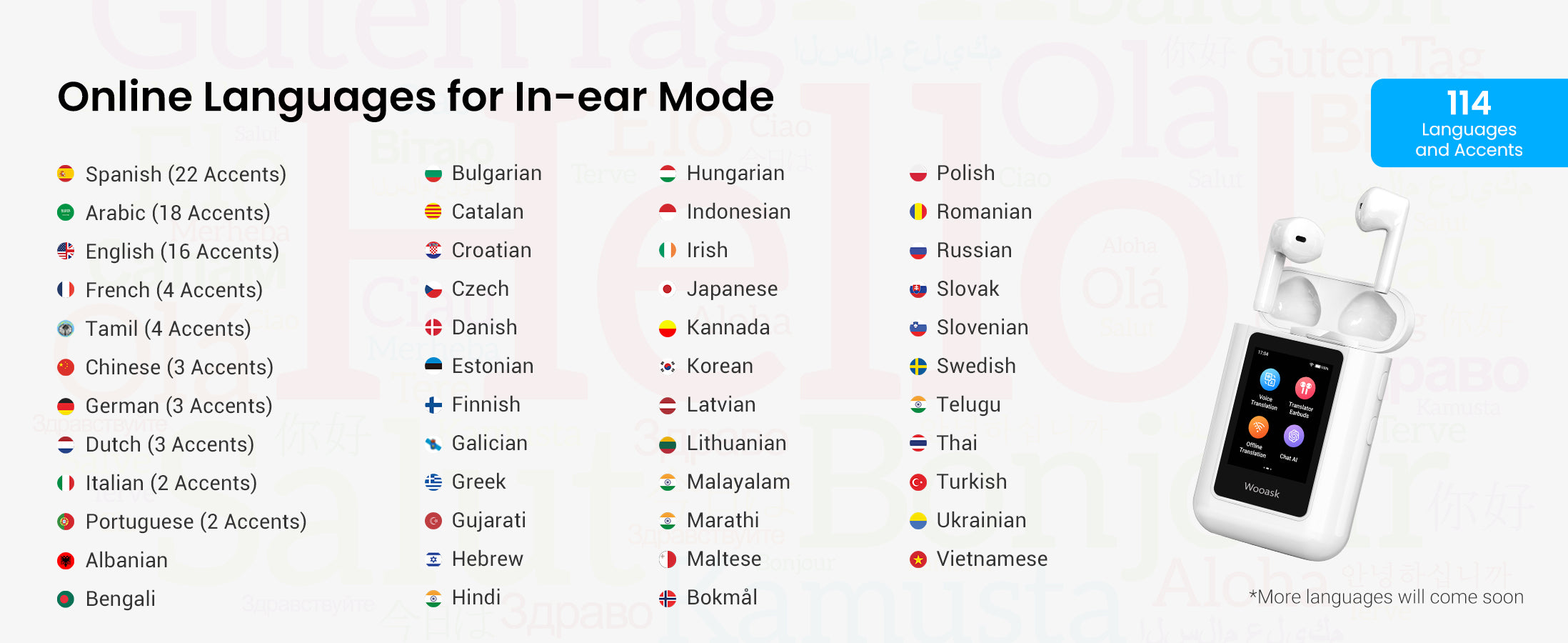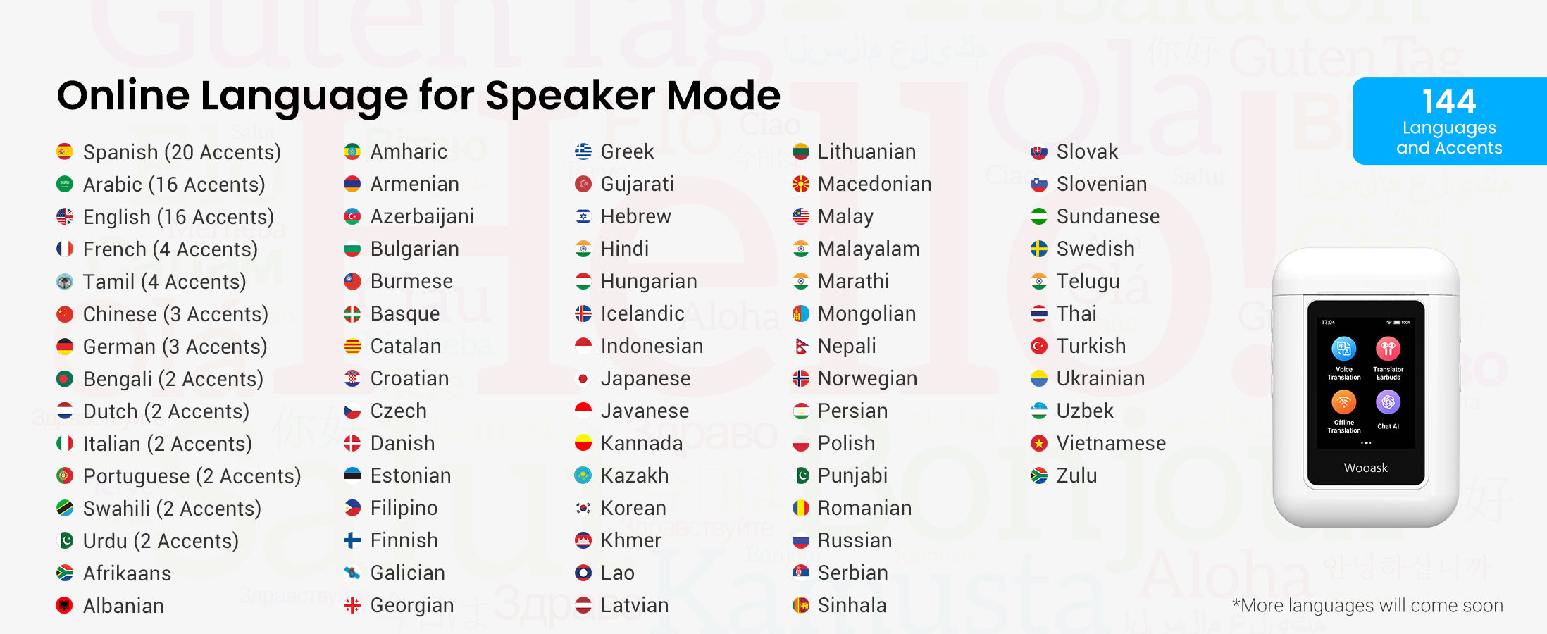 Online languages: 144 languages(74 Languages and 70 Accents)