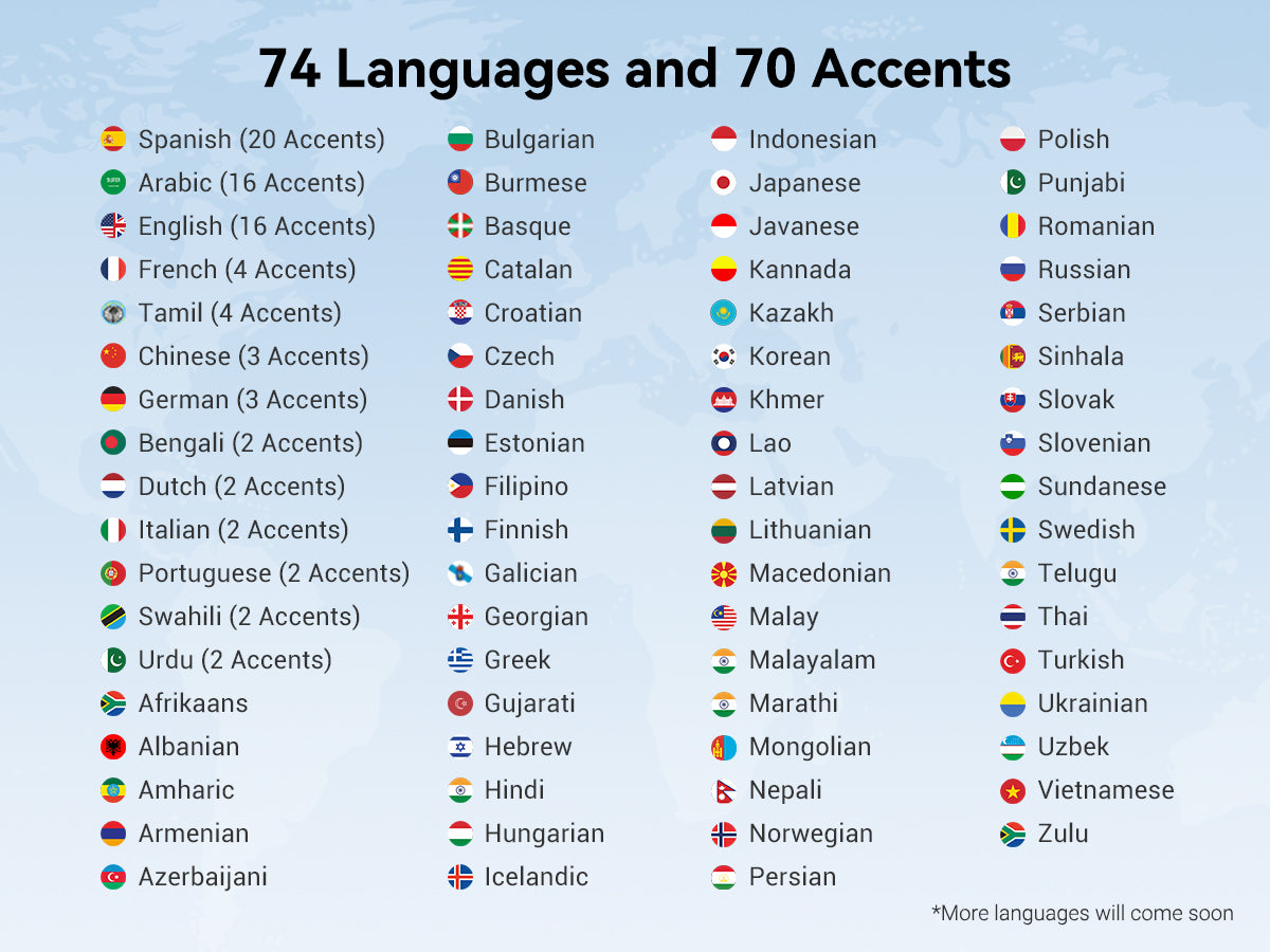 Online languages: 144 languages(74 Languagesand 70 Accents)